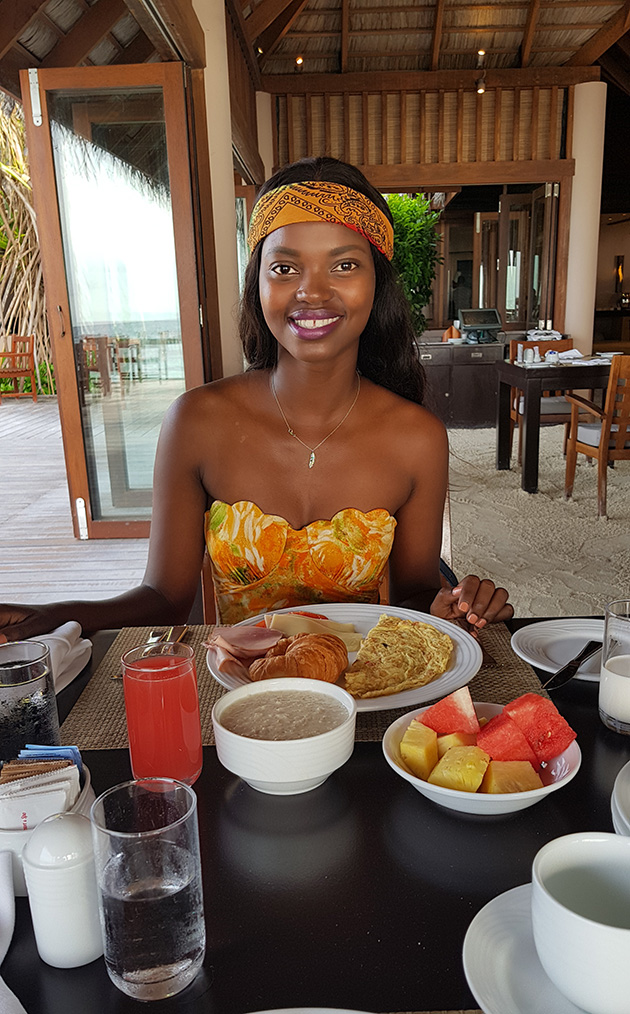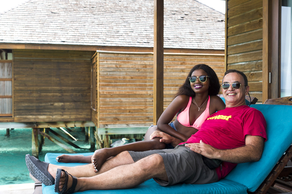 While we generally travel on a budget of $ 70 – $ 100/day and stay in less expensive guesthouses and small hotels, as it was Akhona’s birthday on 10 July I decided to spoil her and splash out with two days at the 5 star Veligandu Island Resort and Spa in an over-the-water villa. As it is low season, the all-inclusive cost with the massive 22% government tax was $535/night (R 7 250), which is about 30% cheaper than their high season rate. A lot of money for independent travellers, but a once-in-a-lifetime experience…