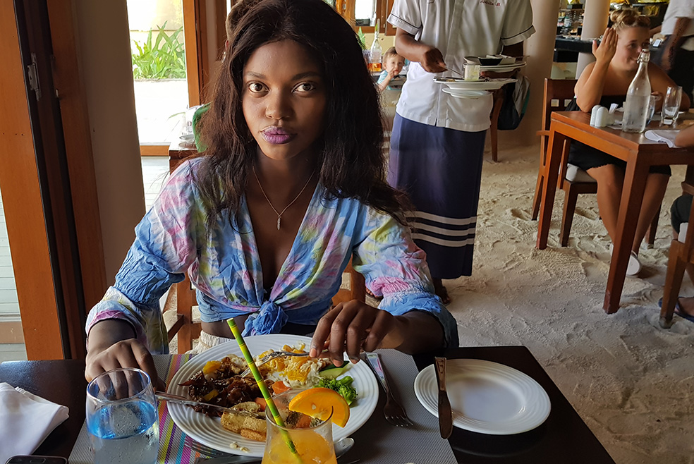 On our final morning at the resort there was time for another quick photoshoot in a pink crocket bikini bought in Bali…The sea was again that magical blue and Akhona pulled out all the stops on the villa’s wooden stairway to get this cool shot. Then there was some time to laze on the sun loungers on the deck before we had to pack and check out at 12h00, ready for our speedboat trip back to Rasdhoo.