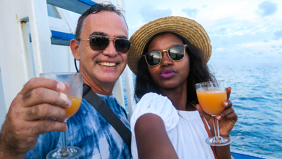 At around 5.30pm we set off on a sunset cruise which, if we were lucky, would include some dolphin spotting along the way. We were given drinks and relaxed on the deck to enjoy the sensation of gliding along over the thankfully calm sea. It was very romantic and we both enjoyed just holding each other and gazing out to sea…