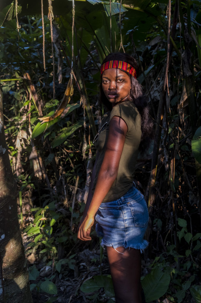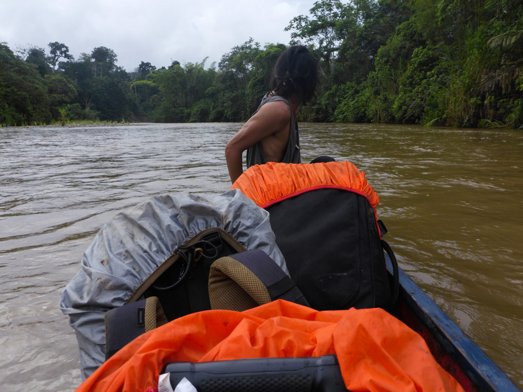 We had been told that we would be taking a motorized dug-out canoe down the river to the compound, but there was also talk of our bags going by canoe while we walked for an hour through the jungle with our smaller backpacks. Both options were fine with us, but when we got to the river there was no motorized canoe in sight. In fact there was no canoe at all. Fabrizio looked around and found an abandoned canoe on the banks of the river. Once in the water it started leaking through a crack in its bottom, but he and Moi insisted that it would be able to carry not only our bags, but also the six of us. I immediately sensed danger and questioned them, but they said it would be fine. We all climbed into the leaky canoe together with our smaller backpacks carrying our photography gear, drone and laptops, as well as our large bags.