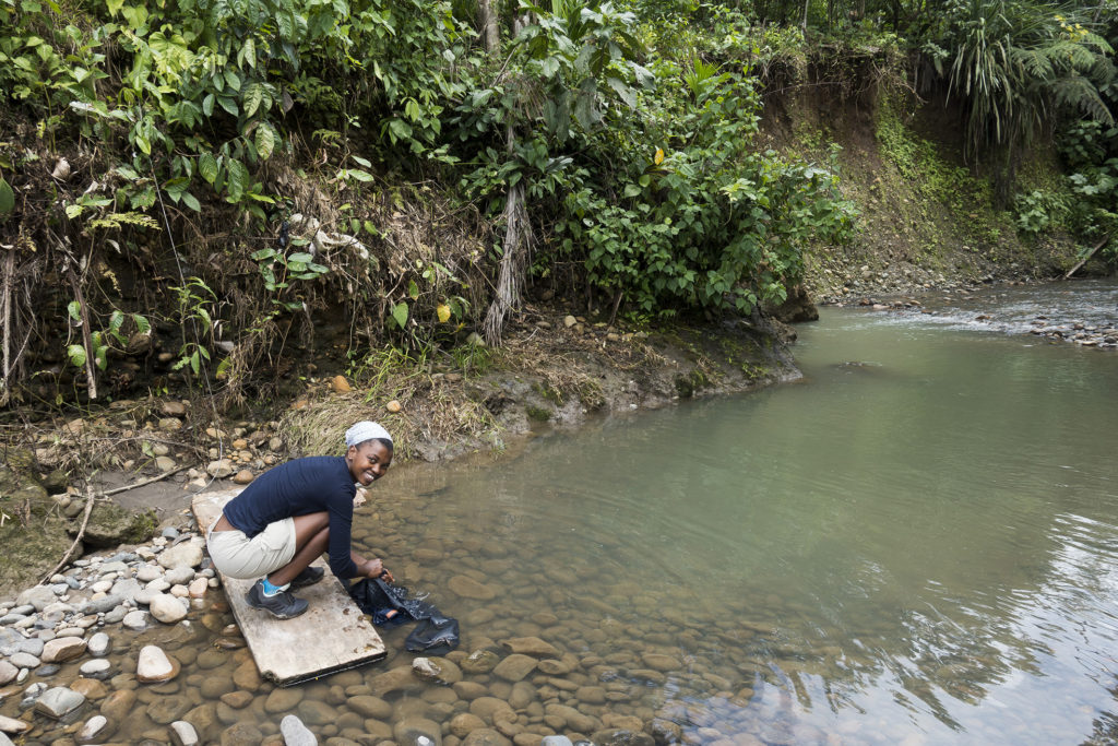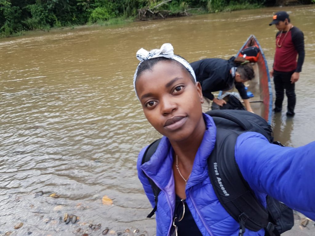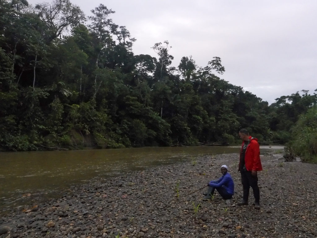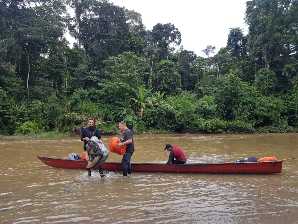 We scrambled out of the canoe and hastily carried our now wet large bags ashore, after carrying our equipment- filled smaller bags to safety. We then discussed our options going forward. We were on the wrong side of the river, with the footpath to the house on the opposite bank. It was decided to load only the large backpacks into the canoe, with Fabrizio carrying on down the river as far as the house, while we would cross the river and walk with our smaller backpacks through the jungle. We walked a hundred meters up the river until we were opposite a small landing spot. The river was quite swift, but Moi assured us we could cross there. I suggested we hold hands and cross as a group of 5 to support each other, but Moi decided that we should cross one by one. He led the way, and grabbed Akhona’s backpack with our drone, gimbal and her Macbook inside. This proved to be a bad idea, which became more apparent as he set off across the fast-flowing river. About two-thirds of the way he began to lose his foothold and the river threatened to sweep him off his feet. It was probably only our shouting that gave him the extra boost to recover and scramble to the other side, but not after Akhona’s bag got a bit of a dunk in the river for a few centimeters. We were pretty sure the water would have reached her Macbook. Disaster!