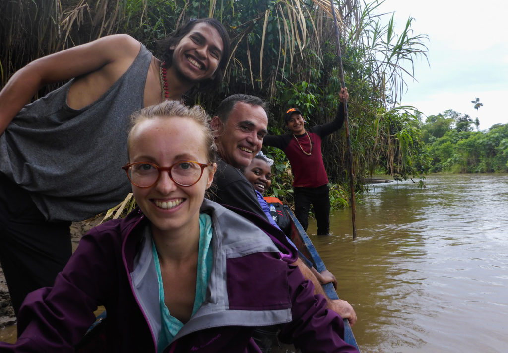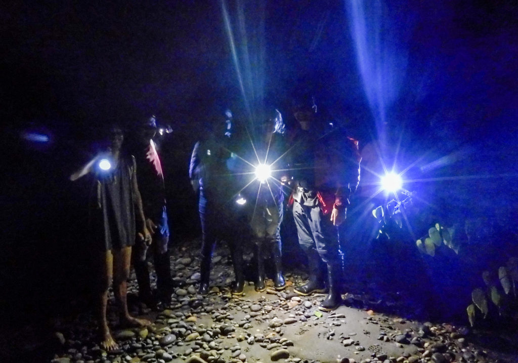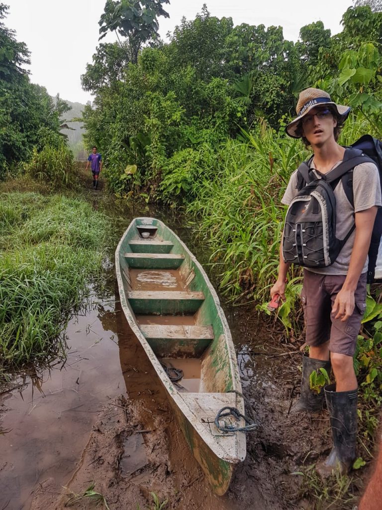 The three of us were thus left standing on the bank of the river, and I decided it would be better to return to the wider beach where we had made our way ashore, as it would be safer that waiting on a 2m river bank with the Amazon right behind us. The wider bank gave us more space to see any oncoming danger like snakes. It was now 16h30. One hour passed. Two hours passed….Darkness fell…Luckily I had a small torch in my backpack to sweep the area every few minutes, as snakes usually come down to the river to drink at night. Then I saw a light amongst the trees….Hooray! But then I realized it was just a firefly. Another 30mins passed, and finally we saw a flashlight on the opposite bank. It was Fabrizio. He crossed the river and told us to wait as he went to find a canoe. He returned after 10 mins, and we got into the canoe, which he then swung sideways and pushed across the river to the opposite bank, where we jumped out. Moi and Adrian arrived at the same time. It turned out that they had attempted to float down the river, and had got lost several times before finding the path to the house. Fabrizio had realized something was wrong and was already heading back when he came across them…