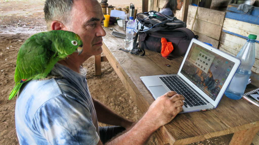 Editing proved to be a bit of a challenge as we had limited power available, only on every second night when they ran the generator for an hour or two, allowing us to recharge our laptop batteries. The family parrot took a shine to me from day 1 and liked to sit on my shoulder while I worked. She is such an intelligent bird, and used to search for bugs in my hair and clean my ears 🙂