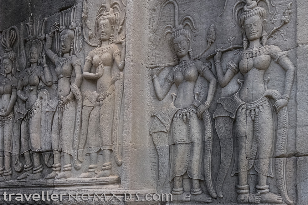 Beautiful relief’s inside Angkor WatIn order to avoid a nightmare experience when visiting Angkor, the clever traveller needs to take a more creative approach when planning a visit. Firstly I would avoid going in the peak tourist season from November to March as the hordes of tourists will make it virtually impossible to get a clean shot of any of the temples. We visited in September in the rainy season when tourism numbers are lower – May and June are also lower than the other months of the year. November and December are the busiest months and Angkor must be very crowded then. Even in the quieter months it’s hard to find a time during the day when there are not tour groups at each and every temple.