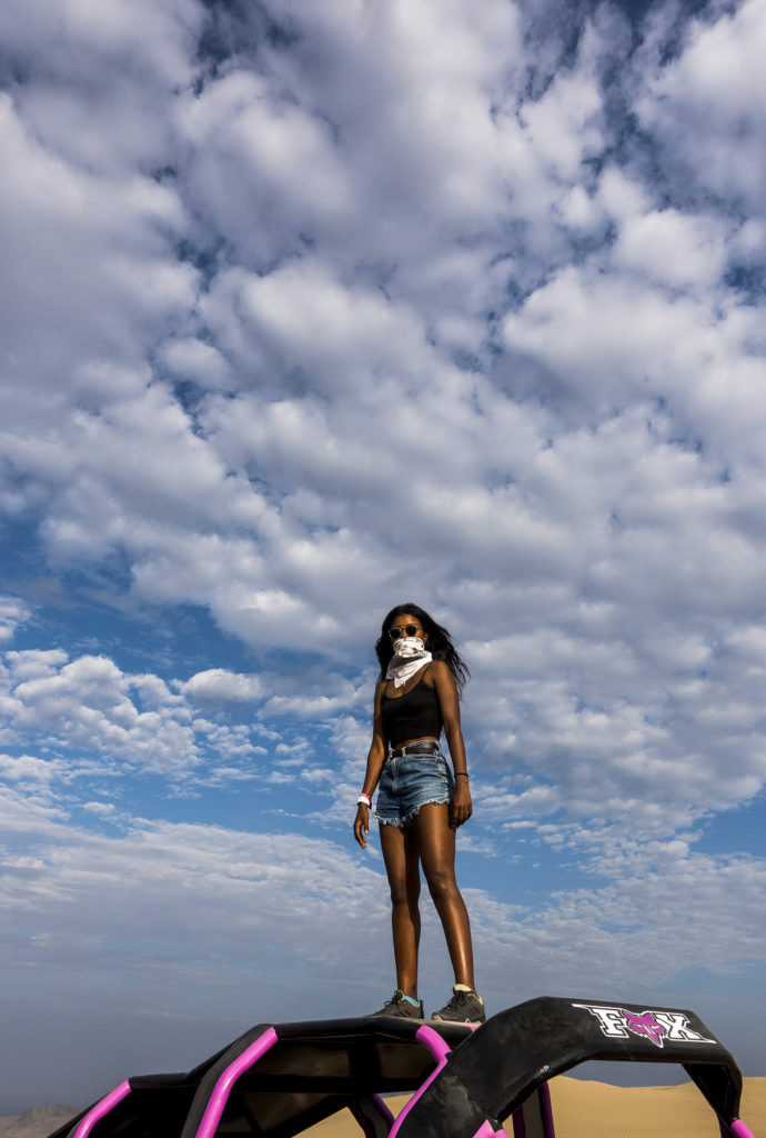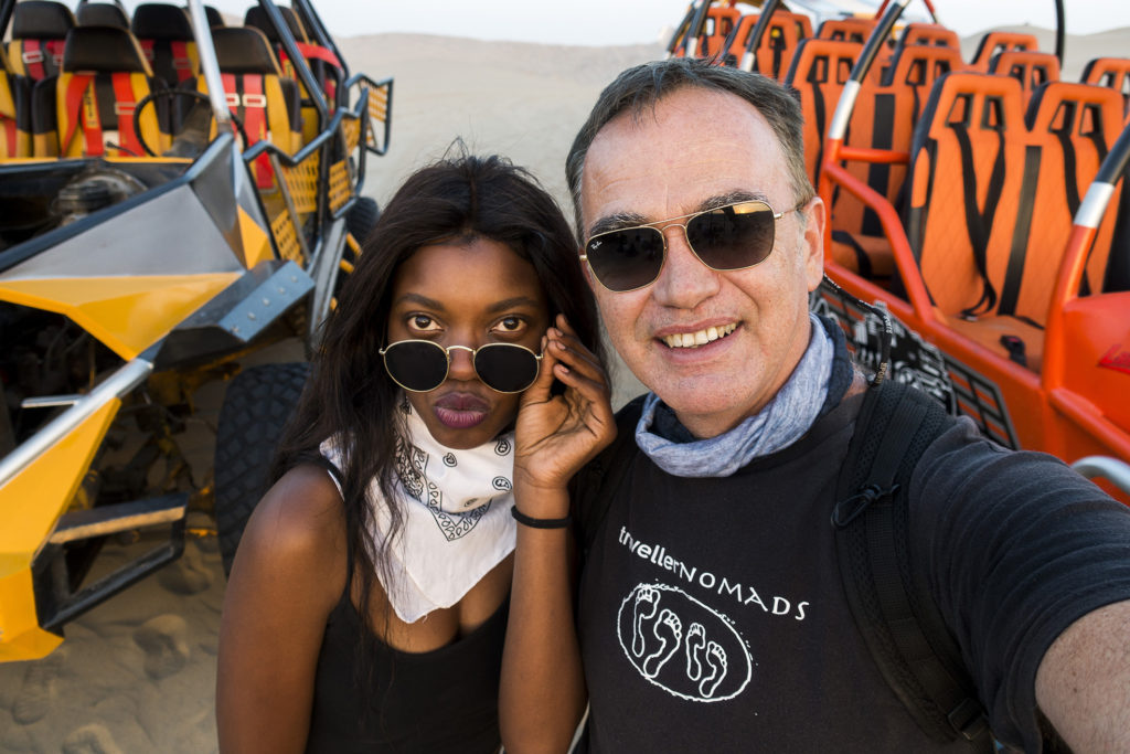 Then we drove for another 10 mins to a lookout point over the desert where we stopped to watch the cool sunset and relax a bit after all of the adrenalin of the hair-raising buggy ride and the sand boarding. I took the opportunity to shoot a few pics of Akhona amidst the dunes and the buggies 🙂
