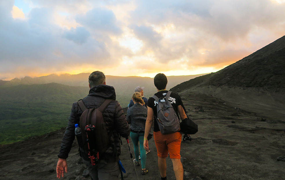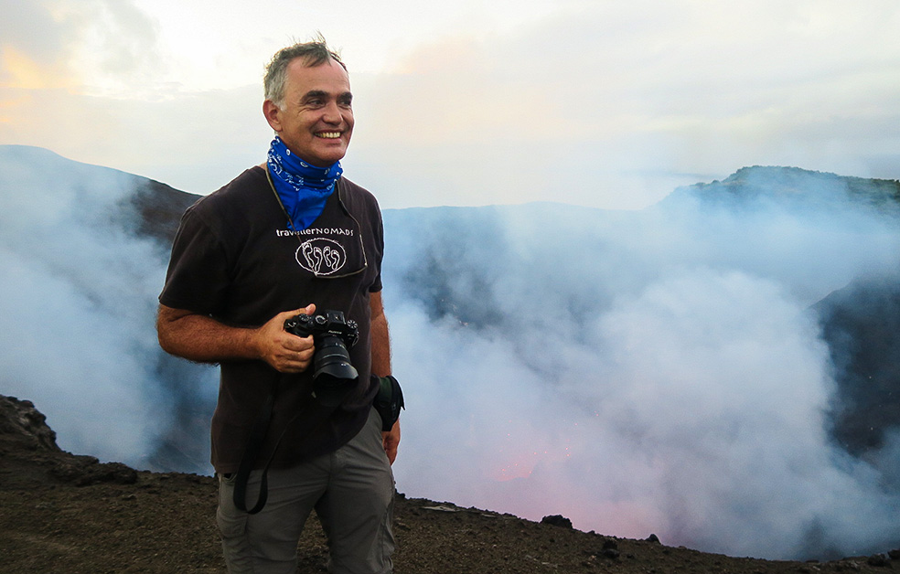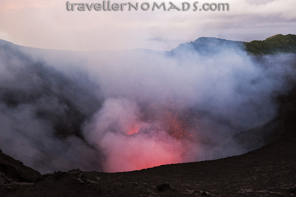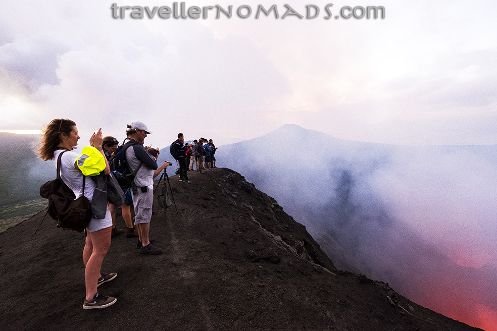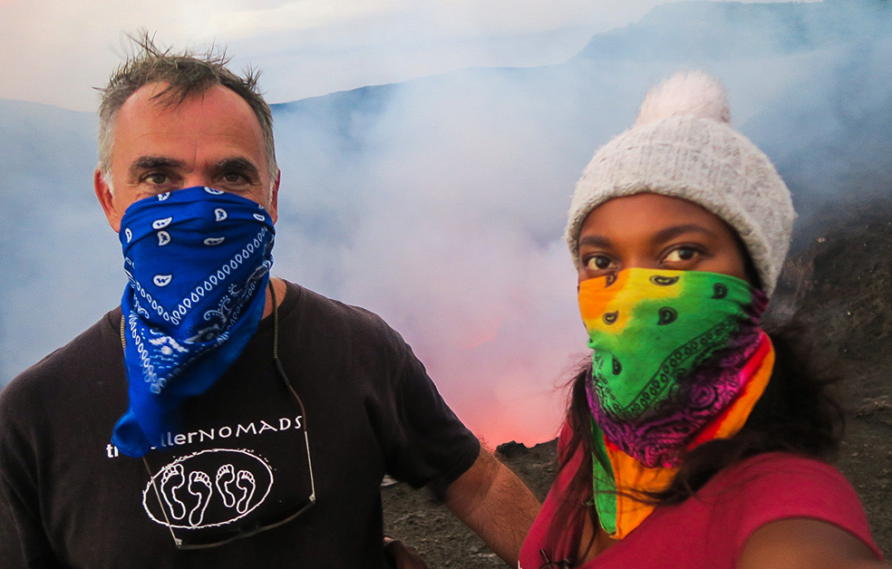The volcano itself is of course a magnificent spectacle to behold, depending on how active it is. When we visited it was at level 2 of activity which made for some cool photographs of us perched on the rim overlooking the caldera. The conditions were at times extreme, with massive plumes of volcanic ash laced with noxious sulphur engulfing us on three occasions, accompanied by gale-force winds and some lashing rain just to magnify the discomfort. Luckily these conditions subsided after 5 – 10 mins and we could continue to marvel at the might of Mother Nature in her rawest form.