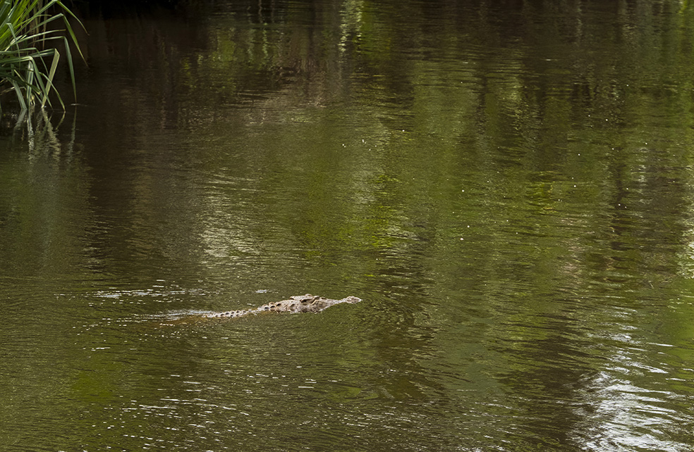 At 07h00 on Day 3 we were up bright and early to enjoy our final breakfast on the klotok before we set off on the long cruise back to Kumai. Along the way we saw a few troops of the strange probiscus monkey. The dominant males have a large, almost human nose which makes them look almost comical. We were also lucky enough to see two crocodiles, one of which I managed to photograph, and then totally unexpectedly Akhona spotted a wild orangutan male perched in tree in the jungle on the opposite side of the river to the National Park. I managed to get a belated partial shot of him, but it was a suitable last sighting on our trip. Minutes later the rain came down and the weather blinds came down.