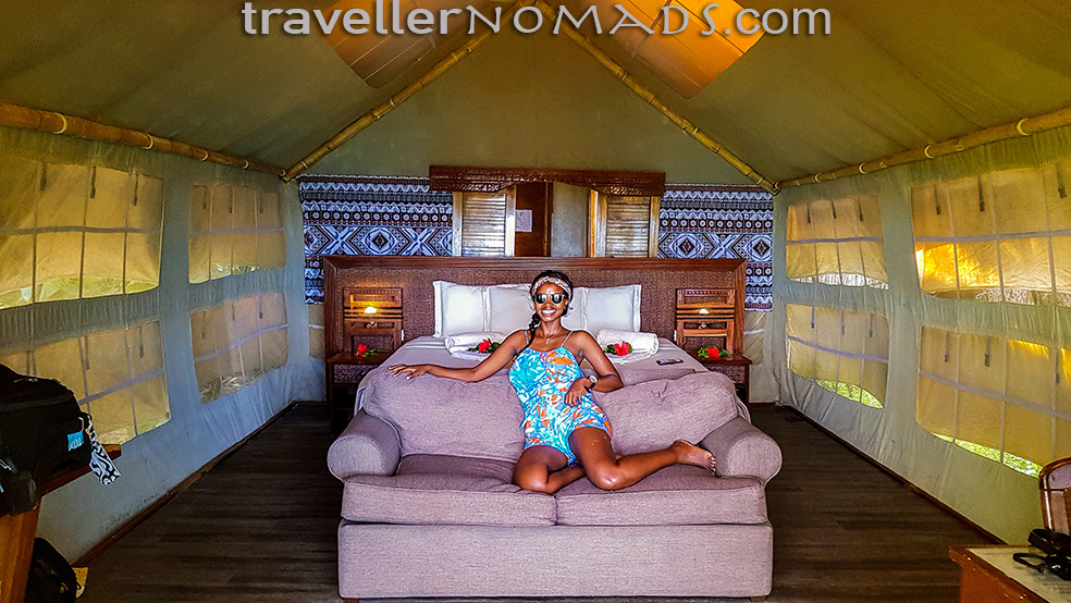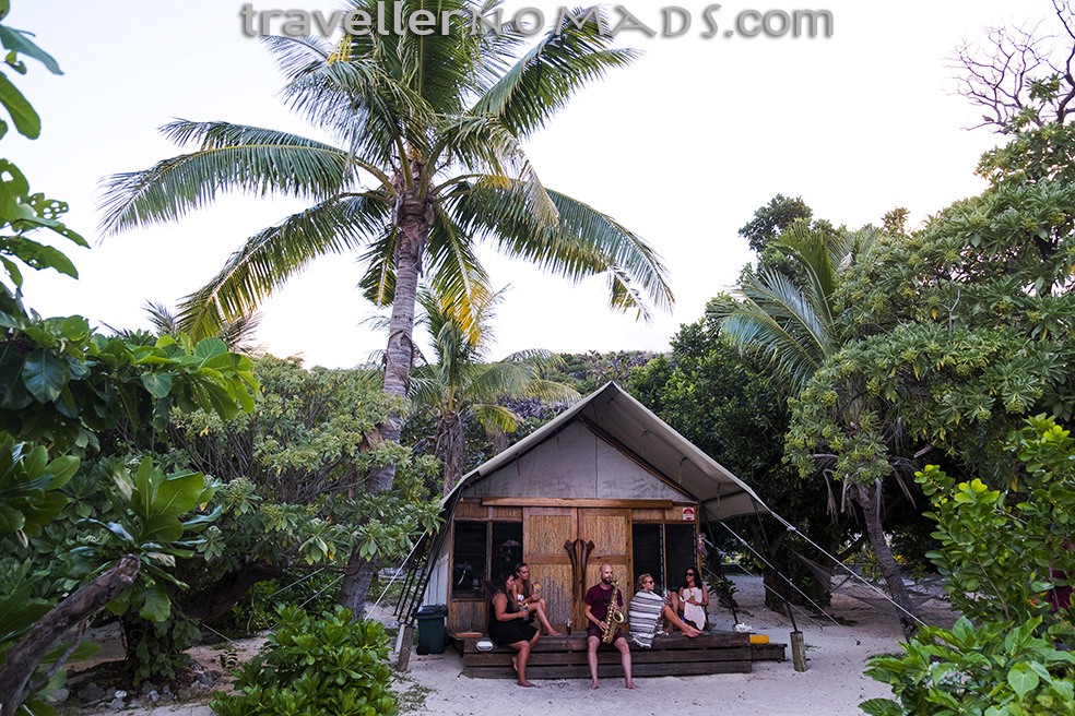 Resorts in the Yasawa’s are not cheap by any traveller standards. A dorm bed can cost anything from US$30 – US$60/night excluding the compulsory ‘meal plan’ or ‘resort fee’ charged by over 90% of accommodation in the Yasawa’s, which ranges from $99 – $ 120/person per night in our experience. This means that even backpackers on a limited budget can’t escape paying at least $80/night for a dorm bed and meals at most resorts – usually more. Barefoot Kuata offers probably the best location of a 6 bed dormitory anywhere in the world – literally right on the beach :). I shot the above photo of visiting sax player Joe entertaining fellow backpackers outside their safari tent dorm on the beach a few days before we left Kuata.
