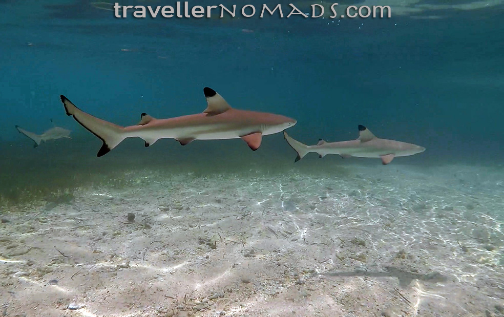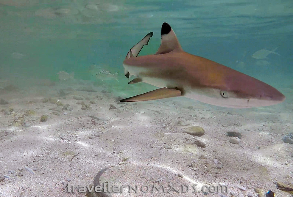 Shortly after getting off the boat which dropped us on the island we had noticed a group of juvenile black tip reef sharks swimming around in very shallow water adjacent to the beach. These baby sharks are around 30 – 50cm long, and have a more aggressive look to them than the round-nosed white tips. We decided to sit in the 1m deep water one morning and try and film the sharks swimming around us. At first they were quite scared of us, and swam away as soon as we approached them. But after about 30 mins they seemed to get used to us, and I managed to get some cool stills and video of them. Check out the cool video’s at the bottom of this post…