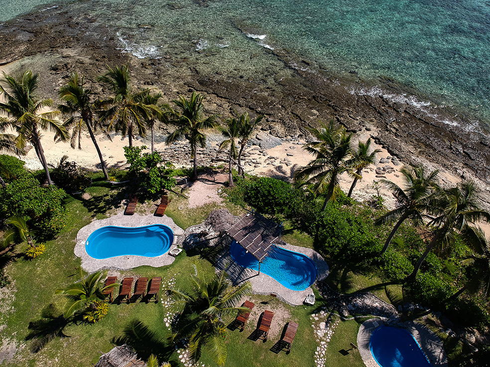Our accommodation was also a canvas safari tent, but was somewhat more plush, with a private bathroom and hot shower attached to the rear of the tent. It was almost surreal to sit on a plush couch in a safari tent looking out over the sea to the neighboring island. Kuata differs from manta in that it has three swimming pools in a large entertainment area, mainly to cater for the daily groups of day visitors the resort attracts. They mostly come to either dive or snorkel with the sharks which call the seas around the island home.