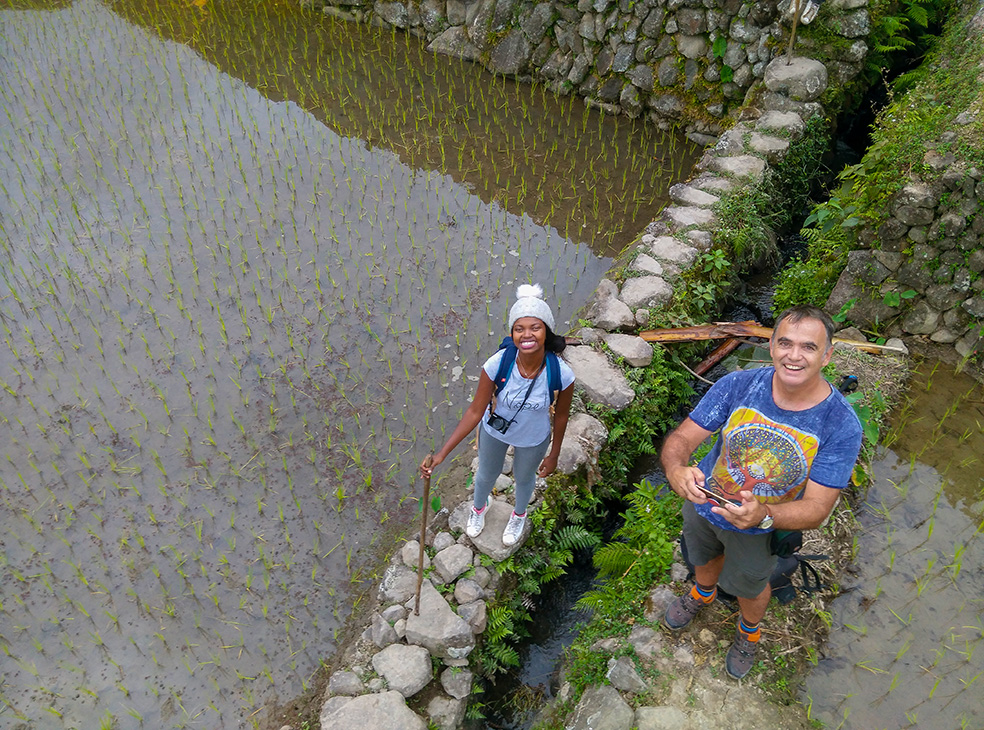 We employed the services of a local guide Sherwin to get us from Banaue to Batad and back safely, and he proved to be a wise choice of guide. He was informative and helpful, and set an achievable pace for two unfit South African travellers. I was glad I had carried a folding hiking stick with me in my bag for the past 5 months – Akhona had to use a wooden stick 🙂 We had a chance to shoot some really cool photo’s of the terraces, and I even flew my little drone to get some cool aerial shots…