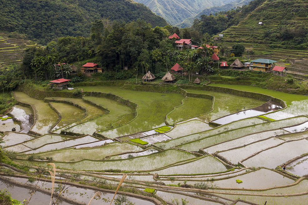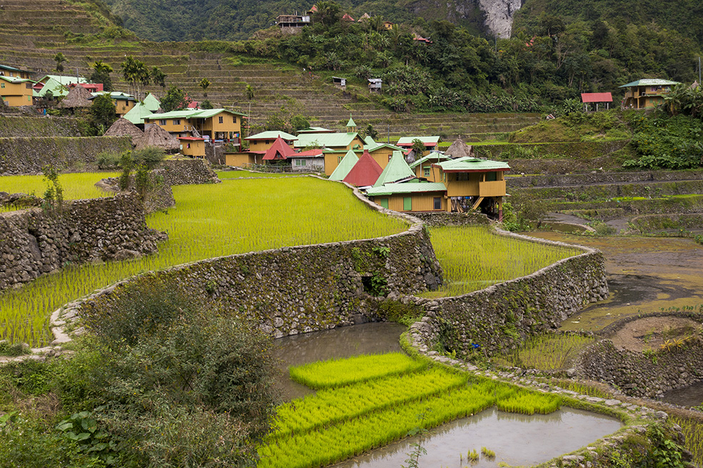 The Ifugao region of Luzon is the home to some of the original tribes of the Philippines who have farmed on the steep slopes of the mountainous area for thousands of years. Over time they carved rice terraces into the mountain sides, supporting them with hand-built stone walls. It is mind-boggling to think that all of the hundreds of terraces were built by hand with no modern equipment. Stones had to be carried from river beds and mountainsides and laboriously fashioned into precise walls. We used the village of Banaue as our base while we explored the area, as it at least has some restaurants and accommodation which surrounding villages lack. The Banaue Sunrise Guesthouse offered a fair-sized room with private bathroom and hot shower for $25/night. It’s views out over the valley and terraces were hard to beat.